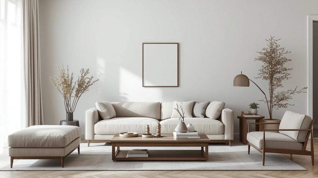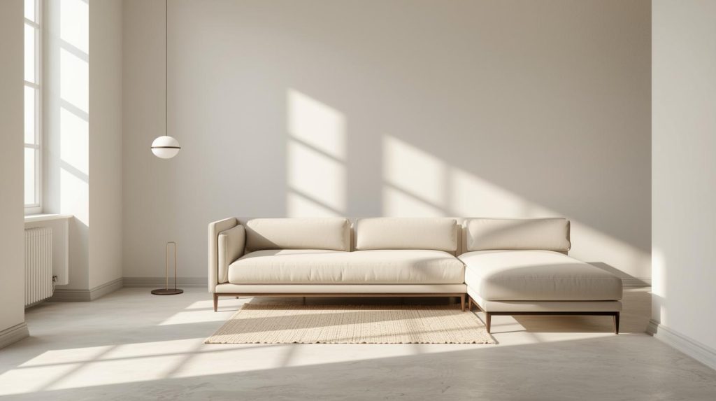 Straight lines, neutral colors, and subtle stitching details define modern living rooms.